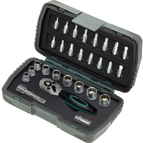 - Travail précis grâce à la poignée ergonomique et aux inserts parfaitement travaillés acier chrome-vanadium cliquet à denture fine, 72 dents pour un rangement propre et sûr dans une cassette en plastique Ce texte a été traduit par une machine.