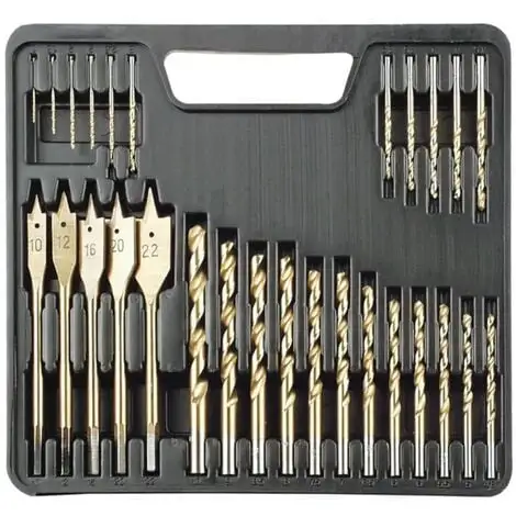 - 23 x foret hélicoïdal en acier rapide, revêtu de titane: 1; 1,5; 2 x 2; 2,5; 3; 3.2; 3,5; 2 x 4; 4,5; 4,8; 5; 5,5; 2 x 6; 6,5; 7; 7,5; 8; 8,5; 9; 10 mm