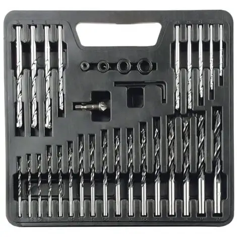 - 17 x foret à bois : 3; 3.2; 3,5; 2 x 4; 4,5; 4,8; 5; 5,5; 2 x 6; 6,5; 7; 2 x 8; 9; 10 mm