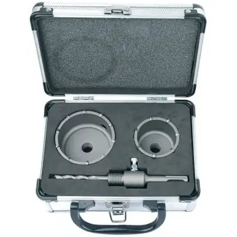 Le kit inclut un foret de centrage avec tige en SDS-plus et 2 adaptateurs de mandrin en SDS. Grâce aux vis de blocage, les adaptateurs de mandrin peut être serrés autour du foret facilement et sans risque. Le kit est livré dans une luxueuse mallette robuste en aluminium.